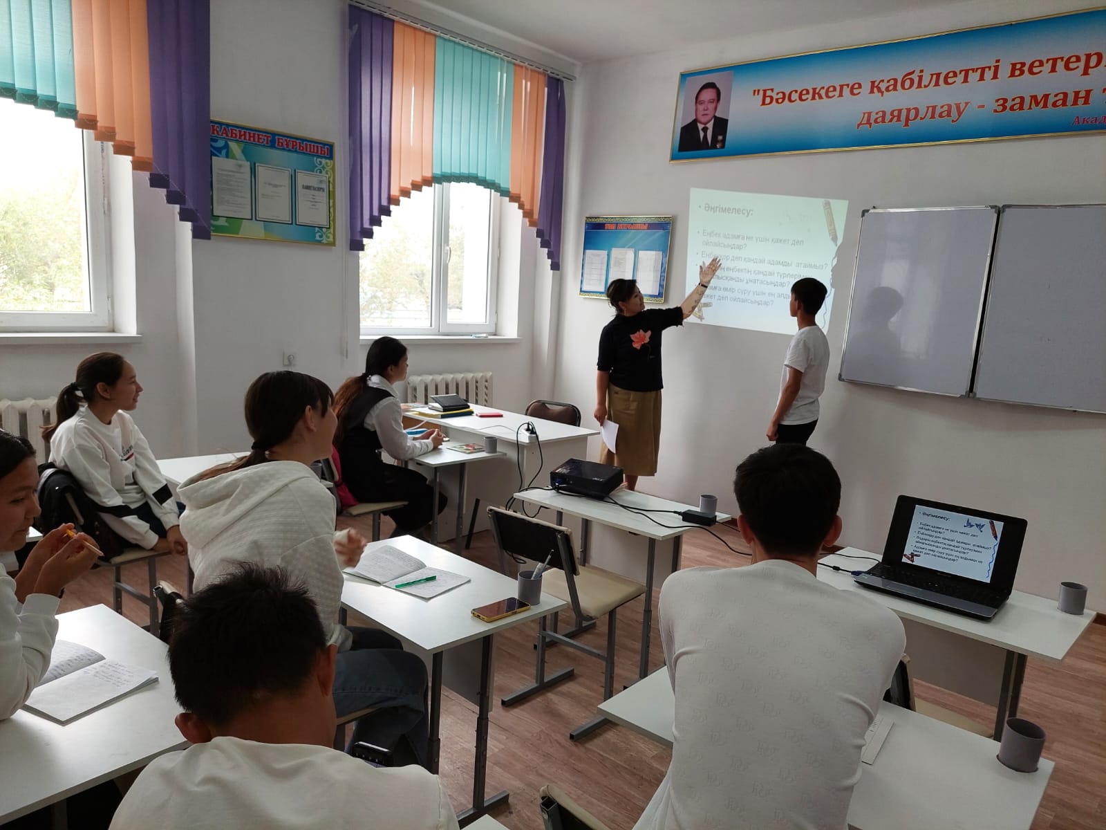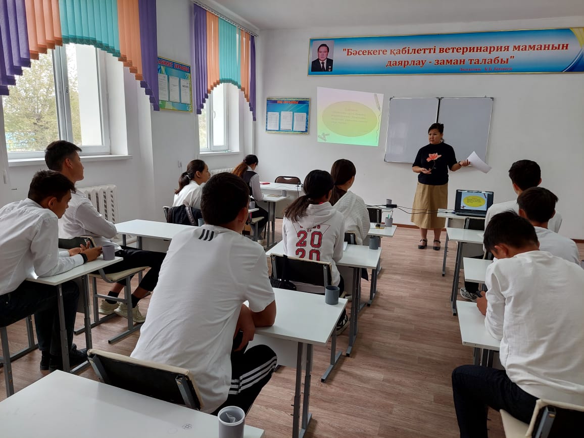 Сабақ барысында Еңбек күнінің қашан қабылданып, қай күні аталып өтетінін, мерекенің мән-маңыздылығы туралы толық мағлұмат бере отырып, «Еңбек ардагері» медаліне кімдер лайық бола алатыны туралы сөз қозғалды. Осылайша еселі еңбектің еленгені қоғамда еңбек құндылығының маңызын арттыра түсетінін айта келе, студенттерге «Еңбек», «Еңбексүйгіштік» деген ұғымдардың адам өмірінде қаншалықты маңызды екенін тағы да атап өтті. Студенттер тақырып төңірегінде сұрақтарға жауап беріп, дұрыс әрекет құндылығының тереңірек ұғынуға, адам еңбек ете отырып, жауапкершілік, еңбекқорлық, төзімділік қасиеттерін бағалап, жақсы өмір сүруге ұмтылу қажеттілігін түсіндірді.