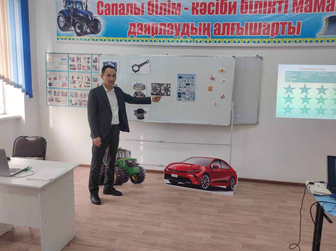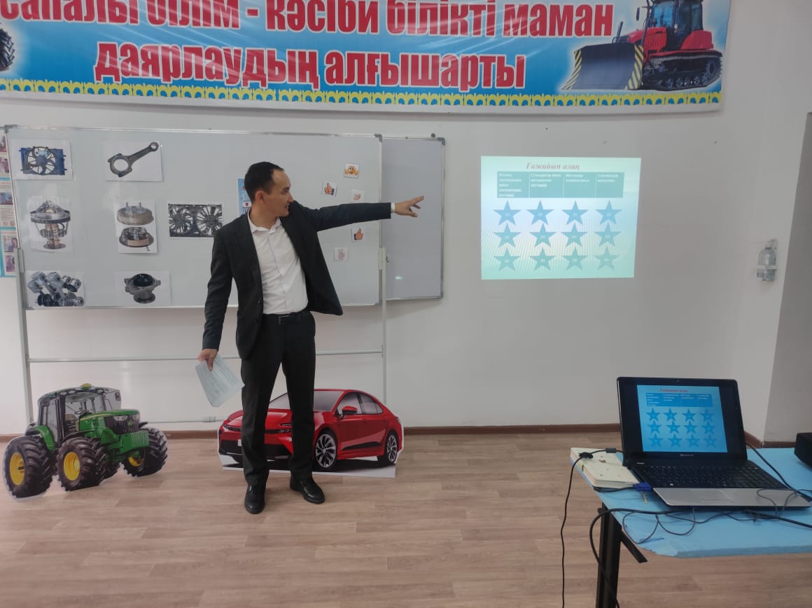 Сабақ мақсаты: - Тақырыпқа сай оқушылардың біліктілігін арттыру, кәсіптік пәндердің қажеттілігіне көз жеткізу. Студенттерге барлық техникалық білімі бар мамандар —ертеңгі күні күнделікті өмірінде қажетті кәсіби пәндермен кездесетіні туралы бағыт беріп, олардың пікірін тыңдау. Сөздік қорын, шығармашылығын дамыту.