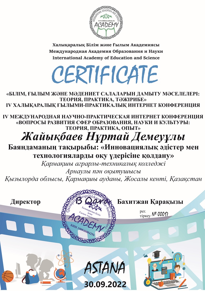 «Халықаралық білім және ғылым академиясы» ЖШС ұйымдастырған «Білім, ғылым және мәдениет салаларын дамыту мәселелері: теория, практика, тәжірибе» атты ІҮ Халықаралық ғылыми -практикалық интернет конферецияда «Білім беруді дамыту мәселелері» бағыты бойынша арнаулы пән оқытушылары Н.Жайықбаев, Қ.Тұрсынбаевтар «Инновациялық әдістер мен технологияларды оқу үдерісіне қолдану» тақырбында баяндама жасады. Қатысушылар сертификат алды және баяндамалары жинаққа енді.
