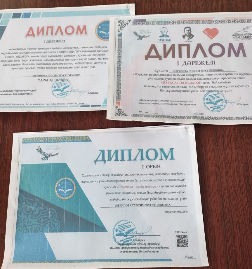 Х/қ «Өрлеу-өркендеу» ғылыми ақпараттық , танымдық-тәрбиелік журналы ұйымдастыруымен өткен «Үздік педагог» және «Парасатты педагог» атты байқауларына үздік жұмысымен қатысып, мәңгілік елдің жарқын болашағы жастардың шығармашылық қабілеттерінің дамуына мүмкіндік туғызып, ұрпақ тәрбиесіндегі еңбегі үшін Шерипова Гулсім Жүсүіпбекқызы