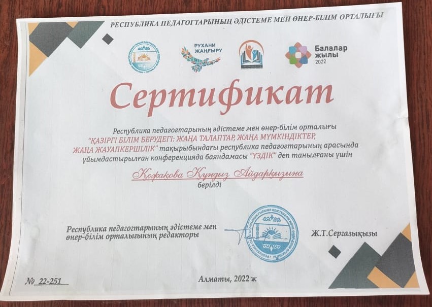 Республика педагогтарының әдістеме мен өнер-білім орталығы ұйымдастырған «Қазіргі білім берудегі: жаңа талаптар, жаңа мүмкіндіктер, жаңа жауапкершілік» атты республика педагогтері арасында өткен  конференцияда  Қармақшы аграрлы-техникалық колледжінің педагог-психологі Құндыз Қожақованың баяндамасы «Үздік» деп танылып, сертификатқа ие болды және жасаған баяндамасы жинаққа енді.